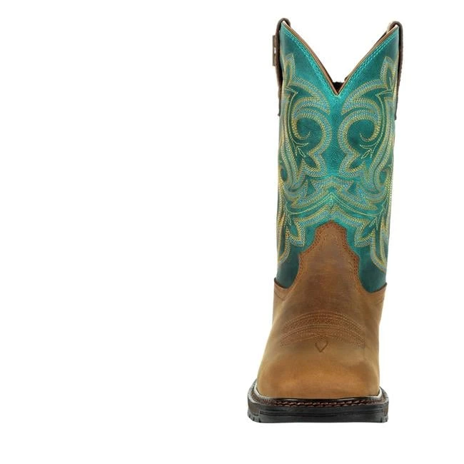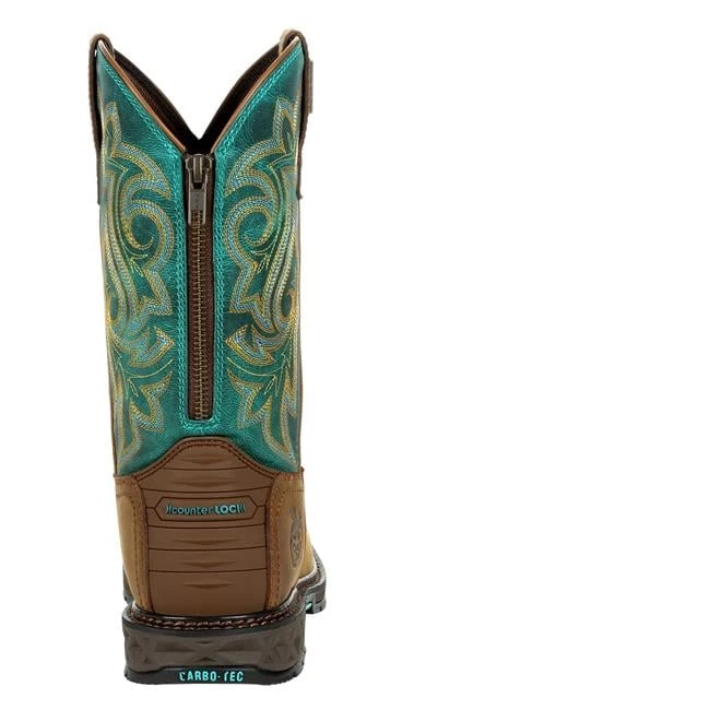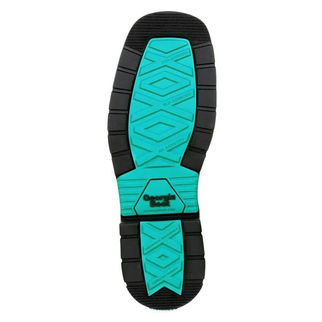 Georgia Boot’s Carbo-Tec LT line is known for an incredibly durable sole with lightweight comfort. This women’s waterproof pull on work boot is crafted with a premium SPR leather. Tougher and more abrasion resistant than conventional leathers, it’s also pasture proof. The special tanning process makes the leather naturally resistant to many chemicals and alkalis found in barnyard environments. The upper features a teal leather shaft with western fancy stitch, leather pull straps and a rear zipper for easy on and off. The interior is where the comfort story begins. The Georgia Waterproof System is designed to be breathable while still preventing water and muck from seeping through the leathers in wet environments. The removable Quick Response polyurethane insole compresses as you walk and quickly bounces back to its original form. The foundation of the boot is also built for comfort as well as extreme durability. A fiberglass shank provides stability and arch support. A thick EVA midsole cushions and acts as a shock absorber as you walk. The outsole is made from our proprietary Carbo-Tec Rubber. The special rubber blend on this women’s wellington gives the outsole a high resistance against heat, chemicals, abrasions, slips and oil. Its has been tested to meet electrical hazard standards as outlined by ASTM F2892 for soft toe footwear.